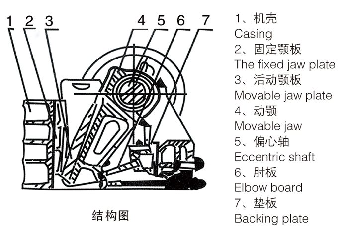 該系列破碎機工作方式為曲動擠壓型,其工作原理是:電動機驅(qū)動皮帶和皮帶輪,通過偏心軸使動顎上下運動,當動顎上升時肘板與動顎間夾角變大,從而推動動顎板向固定顎板接近,與其同時物料被壓碎或劈碎,達到破碎的目的;當動顎下行時,肘板與動顎夾角變小,動顎板在拉桿,彈簧的作用下,離開固定顎板,此時已破碎物料從破碎腔下口排出。隨著電動機連續(xù)轉(zhuǎn)動而破碎機動顎作周期運動壓碎和排泄物料,實現(xiàn)批量生產(chǎn)。